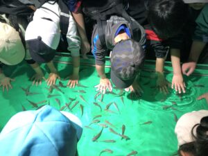 続いてふれあいゾーンでは、魚やヒトデ、エイに触れる体験も👐