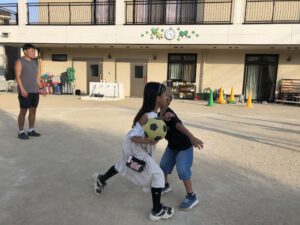 コーンを守る鬼ごっこや、ボール遊びでは、集中力・判断力・チームワークも発揮!
